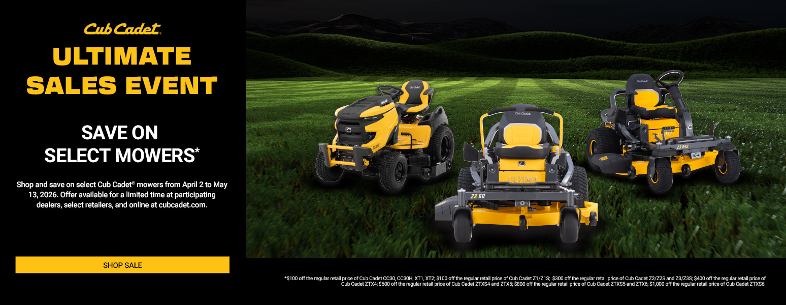 *Offer applies to select products at participating Cub Cadet Dealers, Home Depot, and Tractor Supply Co stores in the U.S. only, and online at homedepot.com, tractorsupply.com and cubdcadet.com for shipments in the 48 contiguous states. Offer valid 3/1/2026 – 4/1/2026, or while quantities last. Discounts vary on different models. Cannot be combined with other offers and does not apply to tax or shipping and handling. If you return the merchandise, the value of this promotion is not refunded or credited to your account. Does not apply to prior or future purchases. No cash value, except where prohibited. Promotion is subject to change. Other restrictions may apply. See Cub Cadet US | Lawn Mowers, Snow Blowers, and Zero-Turn Mowers for list of eligible products.